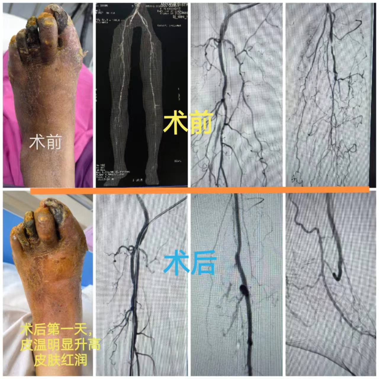 “严重下肢动脉硬化闭塞所致缺血,地区医院血管科再创新技术,经皮下肢静脉动脉化。查阅国内文献,目前没有报道,国外也就几十篇,2023年《新英格兰杂志》报道,该技术很有前景。昨天手术,今天上午查房,足部皮温明显升高。5个小时,没白努力。”
