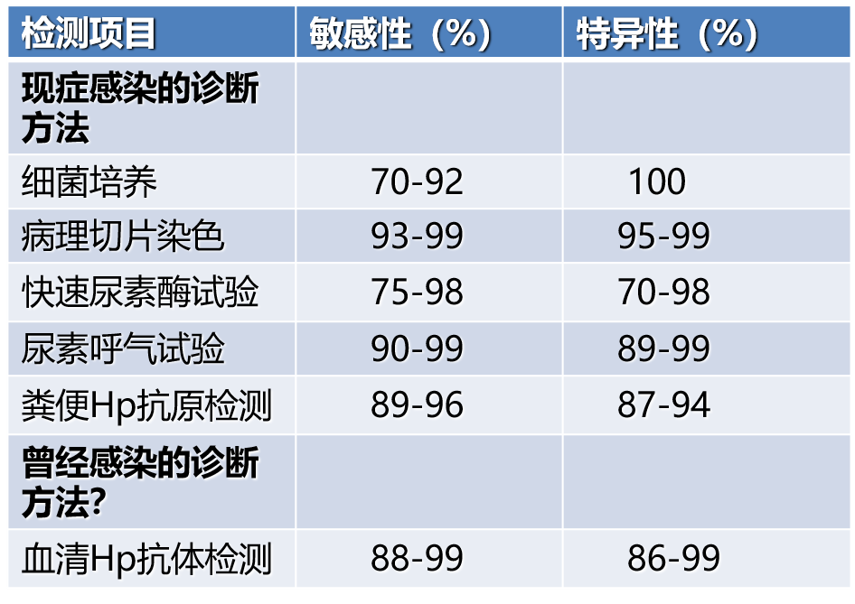 侵入性检测包括:快速尿素酶试验、胃黏膜组织切片染色镜检、细菌培养。非侵入性检测包括:13C或14C 呼气试验、血Hp抗体、粪便Hp抗原检测。