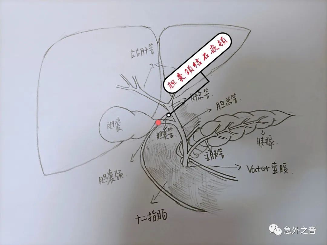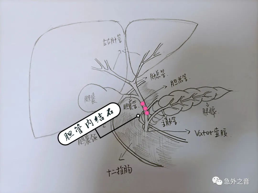 (5)其他:黄疸:极少引起黄疸,结石掉入胆总管,如果引起梗阻,(如下图)会出现梗阻性黄疸。