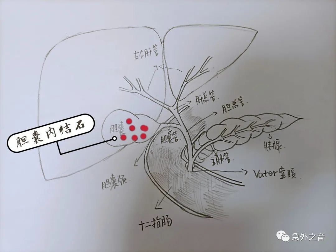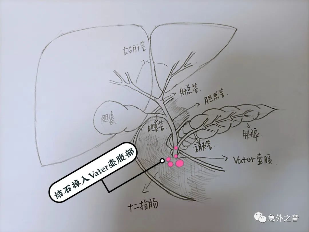 (6)结石掉到Vater壶腹部,堵住了胰液,导致胆源性胰腺炎(如下图)