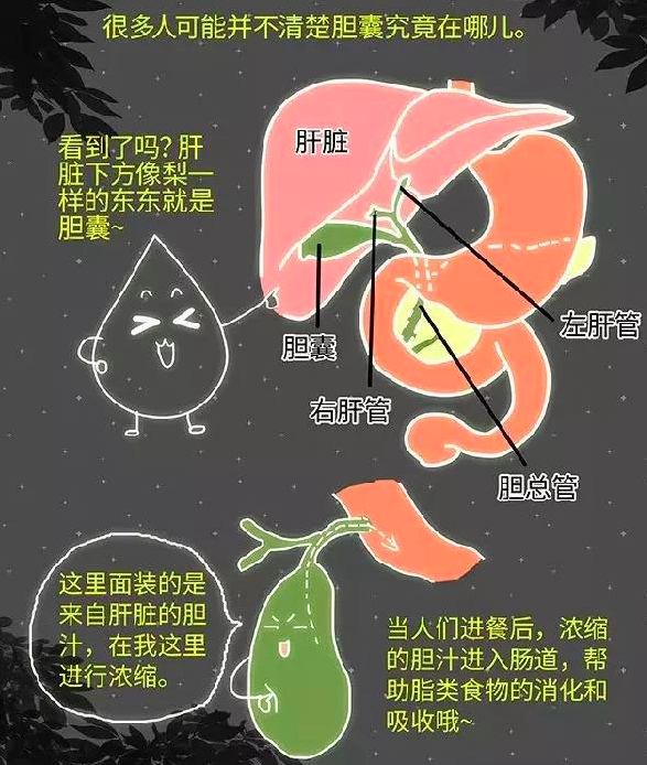 胆囊是位于人体右上腹,肝脏下方一个似香梨形的器官,其生理作用为贮存、浓缩和调节胆汁排放。胆汁是由肝细胞分泌,在非消化期,胆汁经肝管转入胆囊内贮存;在消化期,胆汁可直接由肝脏和胆囊排到十二指肠,促进脂肪的消化分解和脂溶性维生素的吸收。 通俗一点讲,如果说肝脏是自来水总公司,那么胆囊就是蓄水池,肝脏分泌胆汁进入胆囊存储,正常肝脏一天能分泌800-1000ml的胆汁,足足一大瓶可乐那么多,而进入肠道的没有这么多,被胆囊收缩了,大部分水分重吸收,当肠道需要胆汁去消化食物时,胆囊就会收缩,把浓缩的胆汁挤入肠道进行消化;当然还有调节肝内外胆道压力的重要作用;还有重要的分泌和免疫作用。