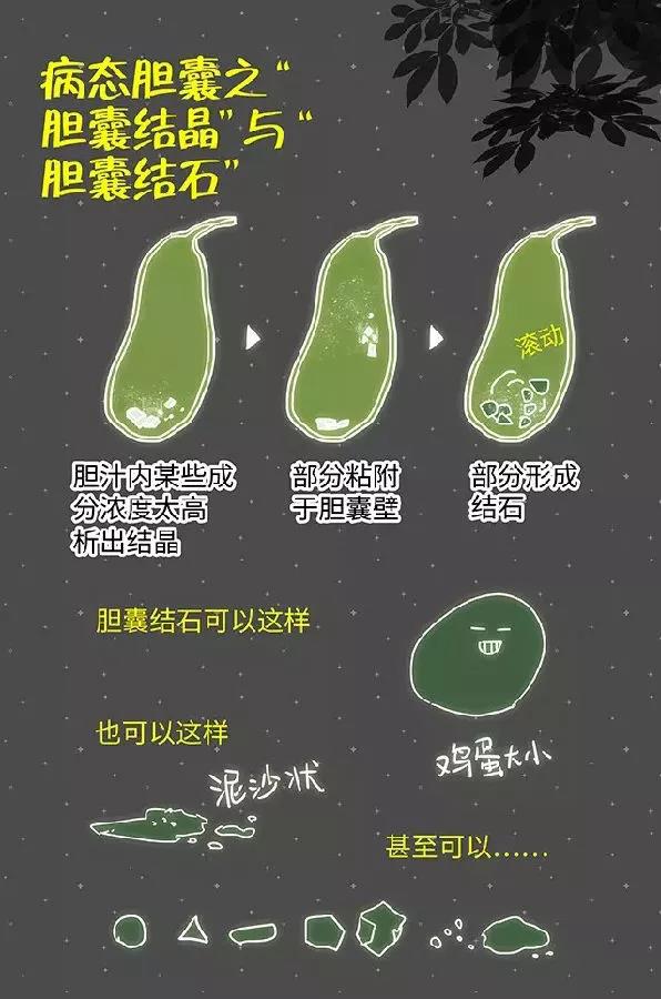 胆汁中含有胆固醇、胆色素、钙质等成分,在高脂饮食、女性激素、肥胖、妊娠、高脂饮食等的作用下,会形成结石。根据胆石成分不同,分为:胆固醇结石、胆色素结石、混合型结石。我国常见的结石是胆固醇结石,或以胆固醇为主的混合型结石。正常情况下胆汁中的胆固醇就好比糖块加进咖啡里一样,悄无声息、水乳相融地沉睡在胆汁里,是无形的。但如果糖加得太多了(胆固醇过多),咖啡里装不下了,那些溶化不掉的糖就会结晶,进而在胆囊内变成“石头”。