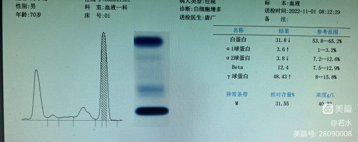 血清蛋白电泳发现M蛋白条带,占比31.55%。