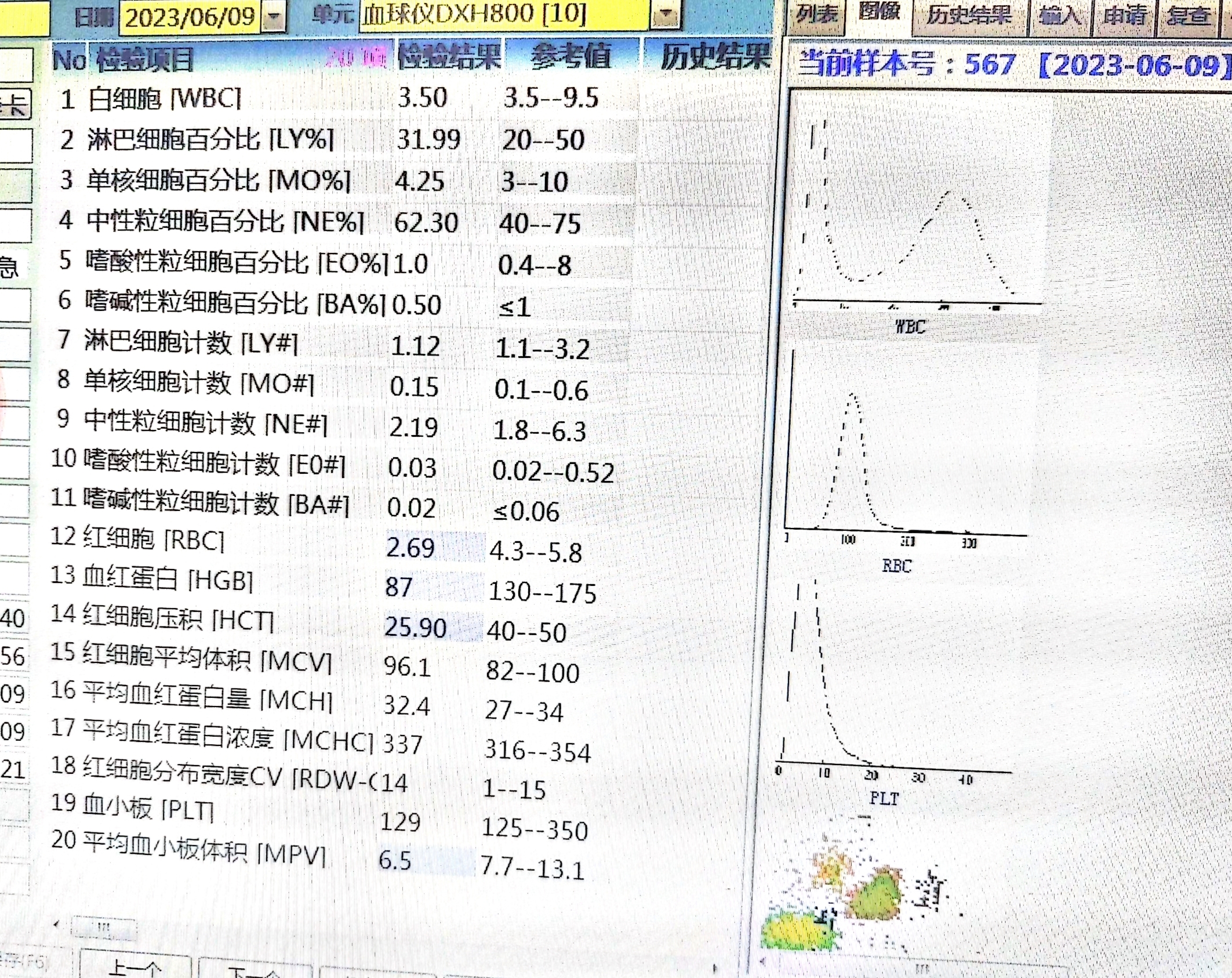 这是一位70岁的老先生的结果,白细胞及血小板数值都正常,只有血红蛋白值低于正常值,87g/L,说明这位老先生已经属于中度贫血。