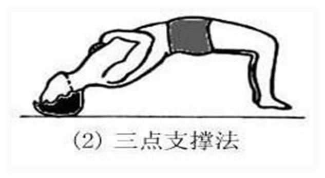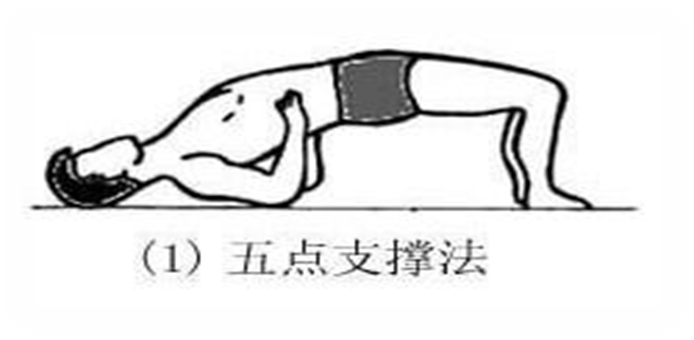 2.“三点支撑”法:仰卧位,上肢放于胸前,采用三点(头、双足跟)为支点,腰背部尽量后伸,使背悬空。该方法是在五点支撑法的基础上,进一步锻炼腰背部肌肉。