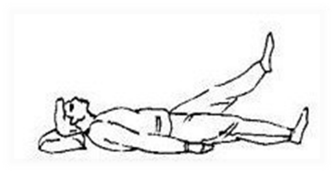4.直腿抬高练习:防止神经粘连。方法:身体平卧硬板床,两腿伸直,用手将患者的下肢抬起,不断提高抬腿高度,并教会患者自己掌握抬腿方法,进行主动练习,初次由30°开始,保持时间由15秒开始逐渐增加,并逐日增加抬腿幅度。 2-3组/日,5-10次/组,双腿交替进行。