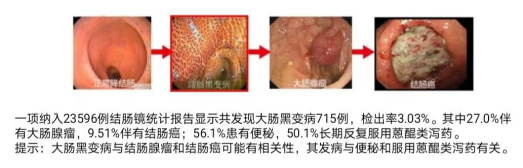 研究提示:大肠黑变病与结肠腺瘤和结肠癌可能有相关性,其发病与便秘和服用蒽醌类泻药有关。