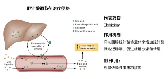代表药物为回肠胆汁酸转运抑制剂(Elobixibat)。Elobixibat是一种不吸收的小分子物质,能通过抑制回肠胆汁酸转运体来增加胆汁酸抵达近结肠近端,促进结肠分泌和运动,增加排便次数,改善便秘症状。