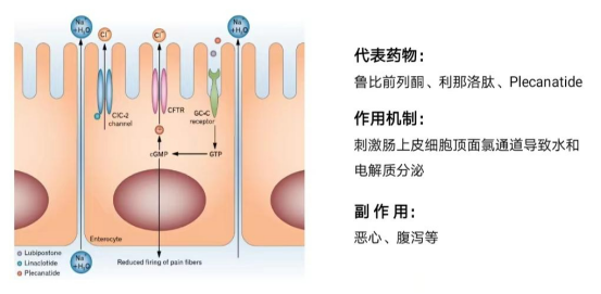 为氯离子通道激活剂,可促进肠道上皮分泌水和电解质软化大便,促进排便。