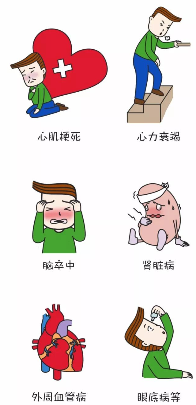 如果高血压长期控制差,会引起动脉硬化,导致心、脑、肾、眼等靶器官损害。血压越高,时间持续越长,伴随的危险因素越多,靶器官损害的程度就会越严重,心血管病的发病风险也就越大。