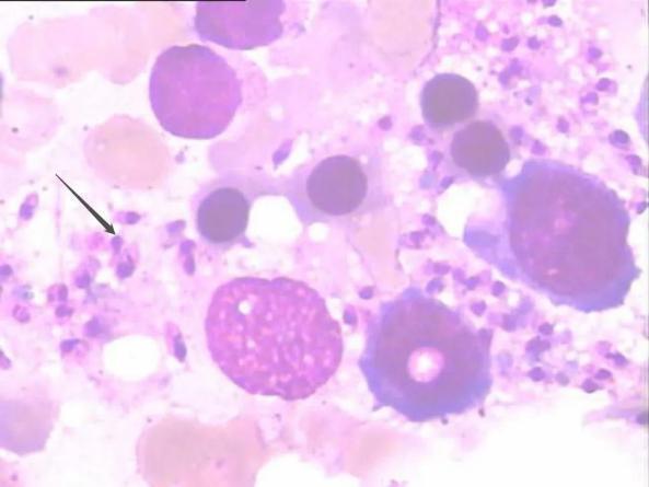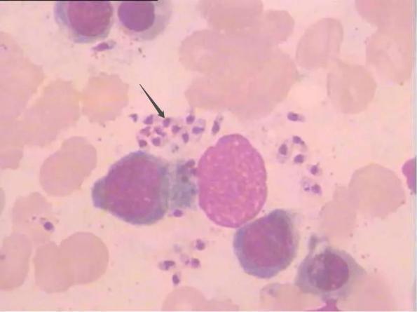 对于上述几例患者,血细胞被吞噬的背后我们也做了大量的排查,包括病毒、细菌、结核、布氏杆菌、自身免疫性疾病、肿瘤标记物、胸腹部CT等检查,均无发现明显异常。结合血液实验室反复阅骨髓片,竟然在骨髓片发现很少量非骨髓细胞成分:杜氏利什曼原虫,行利什曼原虫抗体检测均阳性,确诊“黑热病”,转传染病医院,经专科治疗均得到有效控制。