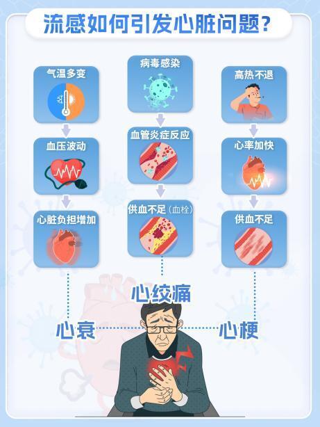 高血压人群的血管长年处于高压下,比较脆弱,流感病毒一旦入侵,容易引起血管的炎症反应,让整个血管内环境都“恶化”起来。而且气温多变,也会造成血压的波动,加重心脏负担,让心衰、心梗等疾病发生的概率增加,甚至重症死亡。