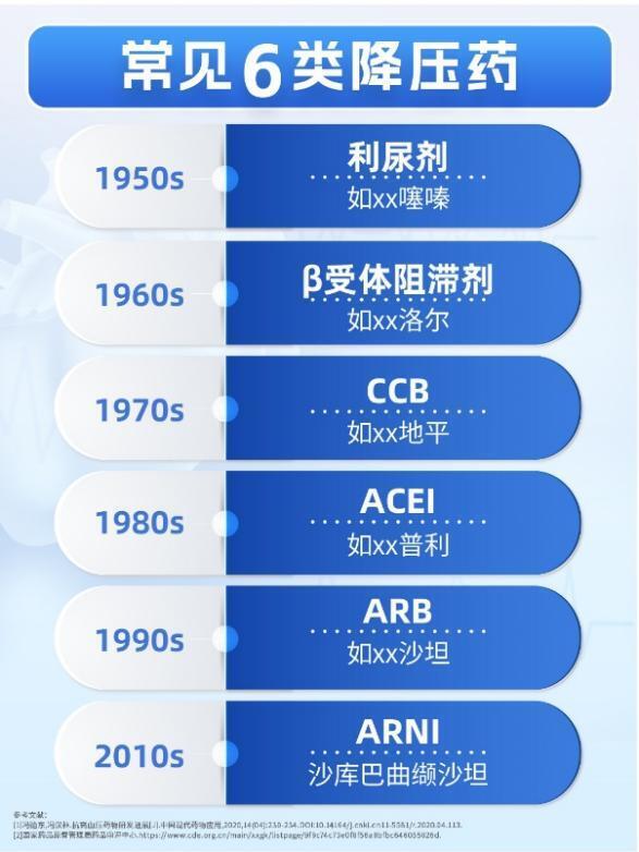 临床常见的降压药有六种:ACEI、ARB、ARNI 、CCB、B受体阻滞剂、 利尿剂,通过“放松”血管、增加排尿等来降低血压。