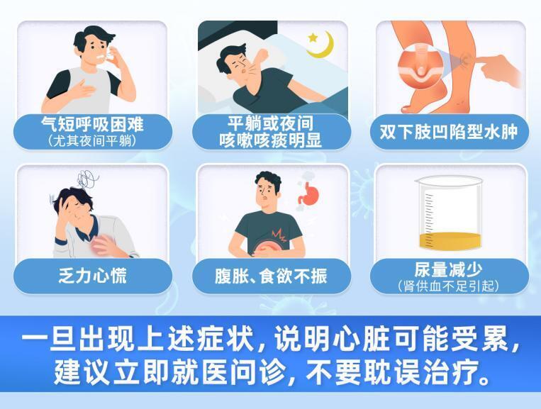 当然身体也会给我们一些预警信号,一旦出现气短呼吸困难、夜间咳痰、双下肢水肿、乏力心慌、腹胀食欲不振或尿量减少等症状,可能是心脏受累的信号,请立即就医,别耽误治疗!快截图保存发给家人朋友,注意起来!