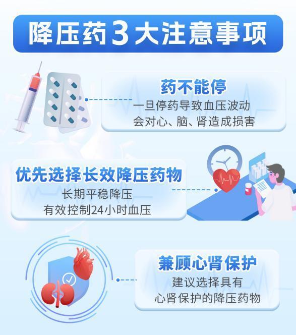 首先规律地服用降压药物,坚持血压监测,将血压控制在130/80 mmHg以内,减轻心血管的负担,降低并发症的风险。