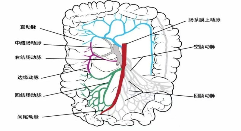 图二 肠系上膜动脉(红色)发出的动脉血管分支(其他彩色血管)