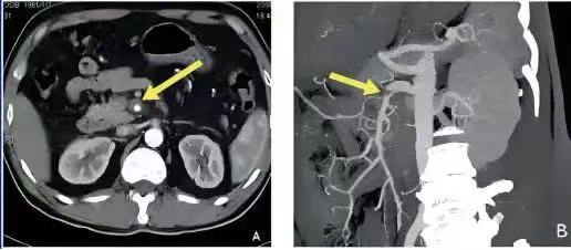 箭头(黄色)所示暗色部分是肠系膜上动脉血栓。