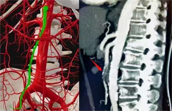 肠系膜上动脉(左图绿色部分),肠系膜上动脉内血栓(红色箭头)。