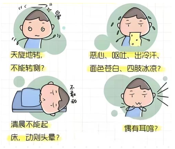 在头部运动时诱发短暂的天旋地转感,常在晨起、夜卧、翻身、低头屈身或抬头仰视时突发出现,伴有恶心、呕吐、心悸、出汗等自主神经症状。眼震发生于头位变化后3~10秒之内,眩晕则常持续于60秒之内。