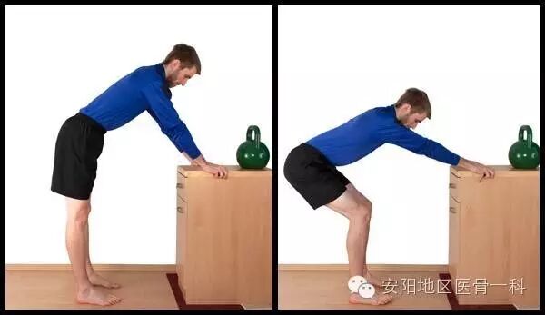 取站立位,扶住椅子支撑身体。健侧屈膝,患侧足部踩平,足趾抓地以保持平衡,慢慢屈曲患膝降低身体,维持5~10秒钟,然后放松、还原。每次10~15个。注意该练习不能过度。