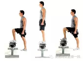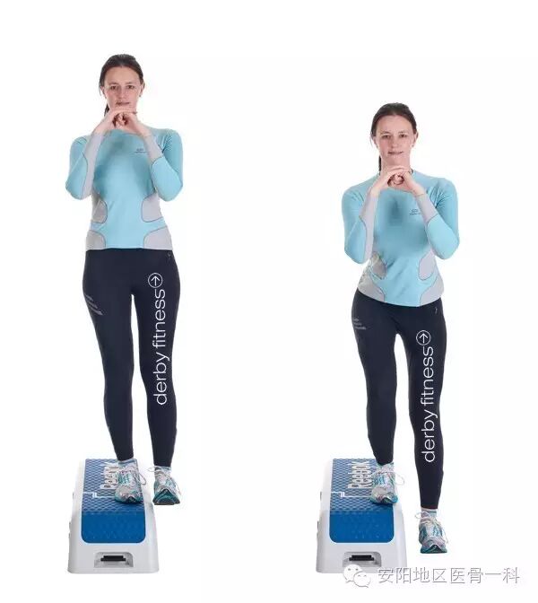 取站立位,前方放一高15cm的板凳。患侧踏上板凳,健侧跟着踏上,然后健侧回到原位,患侧再回到原位。每次10~15个。板凳的高度可以随着锻炼强度的增大而增高。