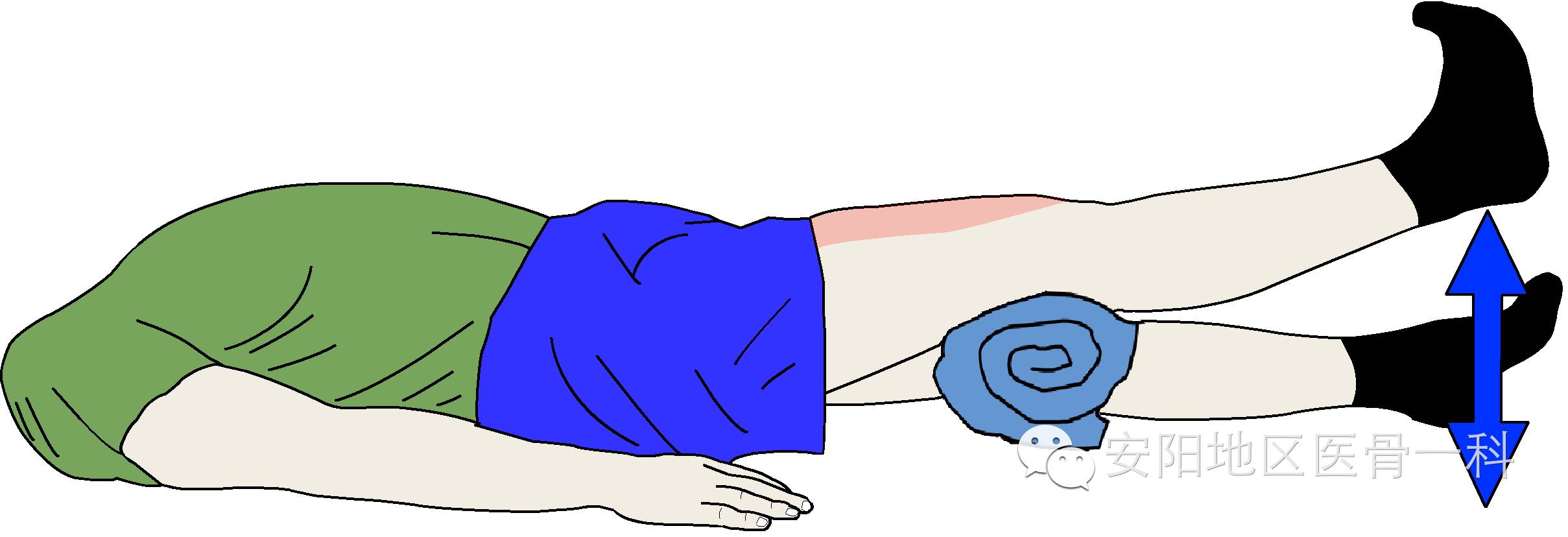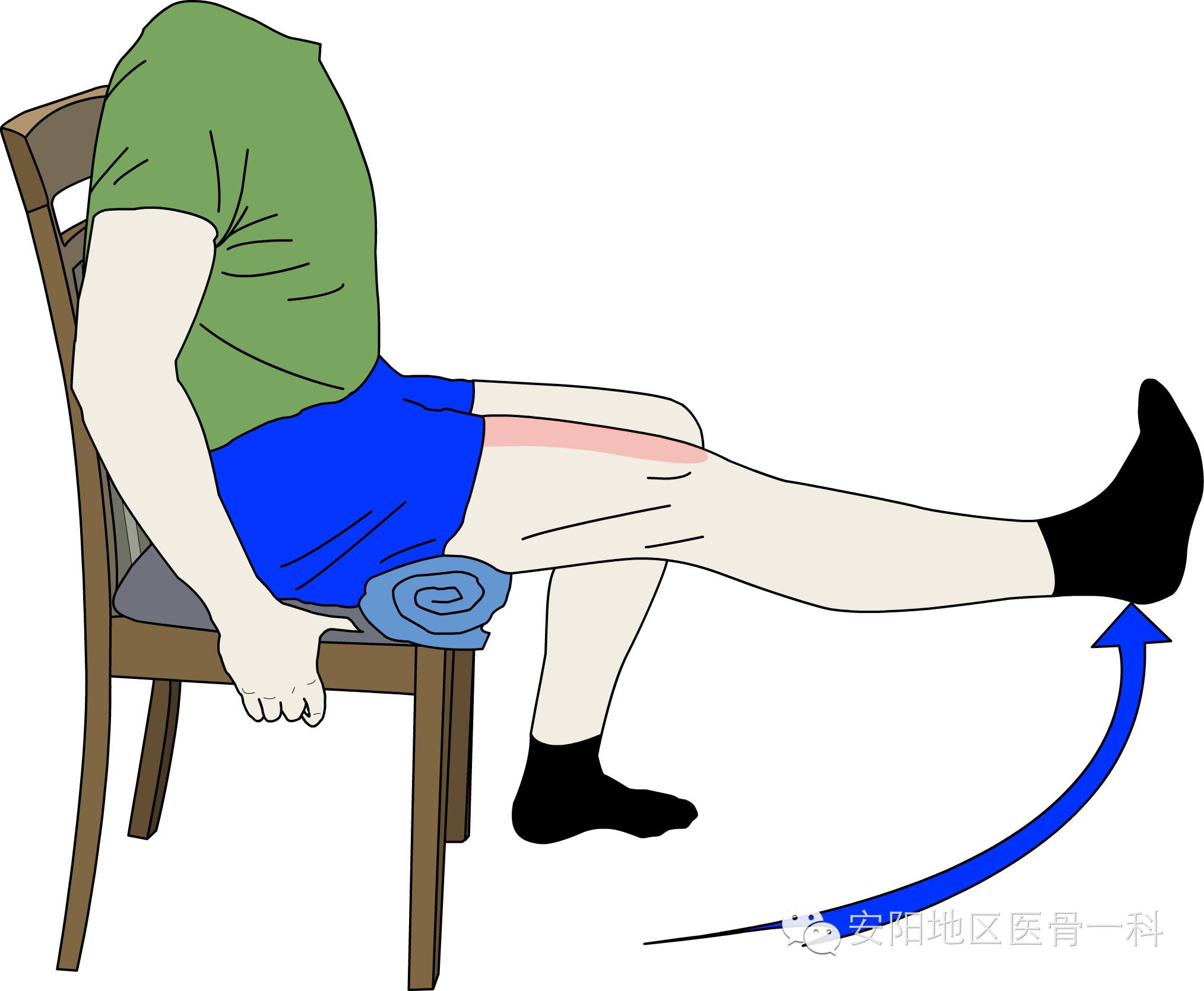 取仰卧位,膝关节下方垫一毛巾卷或软垫。伸直膝关节并维持5~10秒钟,然后放松、还原。每次10~15个。