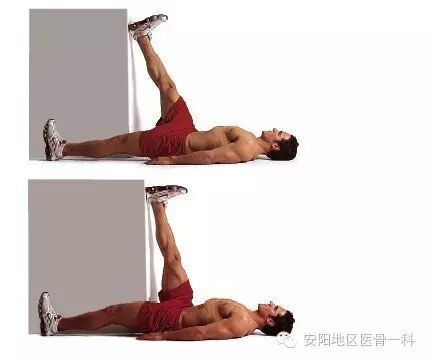 靠门或墙取仰卧位,患侧伸直膝关节抬腿,将足跟靠在墙面上,健侧屈膝,将臀部贴向墙壁。当感觉到膝后紧张时再伸膝,维持5~10秒钟,然后放松、还原。每次10~15个。身体离墙壁越近,牵拉的效果就越好。