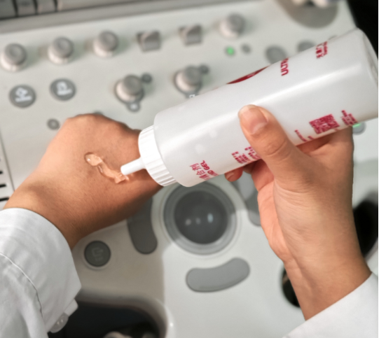 这是由超声波的物理特性决定的,超声成像的原理是利用探头发出高频声波(超声波),声波在人体组织中传播,遇到不同组织的界面时会发生反射,探头接收这些反射波并转换成图像从而进行疾病的诊断。然而超声波有一个特性:它在空气中几乎无法传播,超过99.9%的超声波能量会在遇到空气时被反射回来。如果不使用耦合剂排除空气,超声探头发出的超声波大部分会在皮肤表面就被反射回去,无法深入人体内部,也就难以获取到准确的内部组织图像。耦合剂的存在,就像是在探头和皮肤之间搭建了一座“桥梁”,让超声波能够顺利地传入人体,从而提高超声图像的清晰度和准确性。此外,耦合剂还能起到润滑作用。超声检查过程中,医生需要手持探头在患者皮肤表面移动,以全面观察不同部位的组织情况。耦合剂的润滑特性能够减少探头与皮肤之间的摩擦力,使探头移动更加顺畅,不仅让患者在检查过程中感觉更舒适,也有助于医生更灵活、准确地操作探头,获取更全面的检查信息。