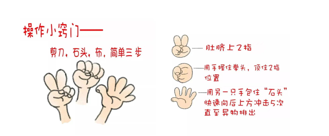 气道异物梗阻患者独自一人时,可采用自救的方法。患者一只手握拳,用拳头的拇指侧紧抵剑突和脐之间(脐上两横指处),另一只手紧握此拳头,用力快速向上向内冲击。