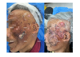 老高,男,65岁,左侧面部烧伤60余年,左侧颞部出现不规则红斑5年,左面颊出现硬结节伴疼痛3年。病理结果示:日光性角化症(颞部),鳞状细胞癌(面颊)。颞部散在不规则红斑给予光动力治疗。面颊肿物给予扩大切除后植皮。