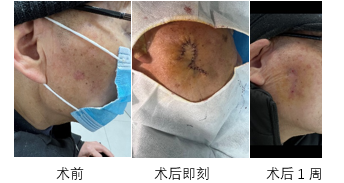 老陈,男,68岁,右侧面颊部红斑3年余,既往诊断为“湿疹”,“面癣”,治疗均无效,来我科病理检查结果为“日光性角化症”,给予手术切除,菱形皮瓣修复。