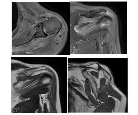 我院核磁检查可见:冈上、下肌、三角肌体积减小,并可见T2WI高信号水肿影,肌束间隙脂肪信号增多。