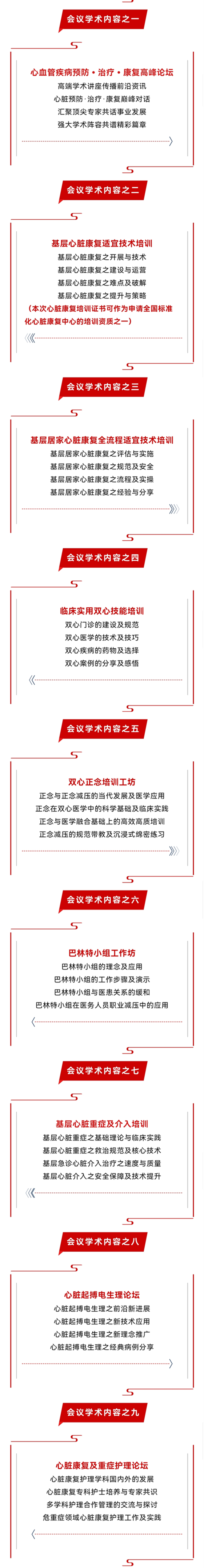 本次大会将继续面向基层,既有学科建设的探讨与交流,又有适宜技术的推广,更有充满人文情怀的双心医学技能培训。同期举办的基层居家心肺预防与康复年会,汇聚年度学术臻粹,培训切合国家政策、贴合当今时代所需的居家心肺康复技术。将在突出基层心脏预防、治疗、康复一体化的大会特色之上,为广大医务工作者奉献一场异彩纷呈的学术盛宴。