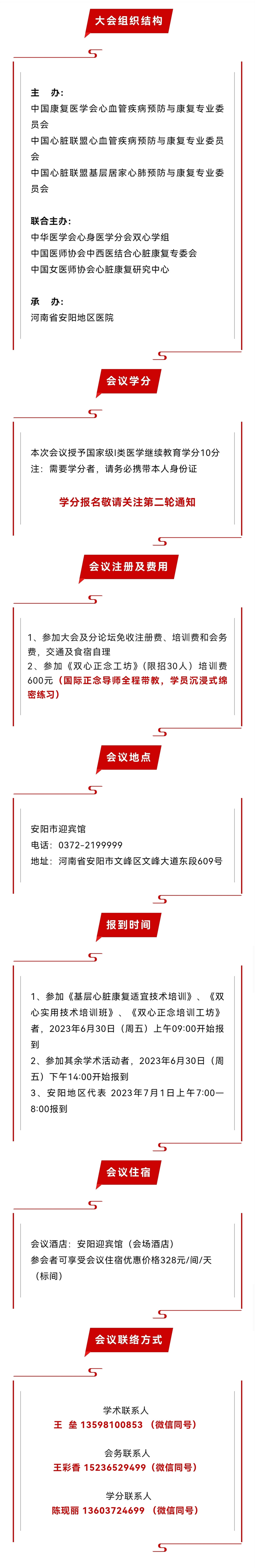 《第七届中国基层心脏康复大会·第五届中国基层心脏重症大会·2023中国心脏联盟基层居家心肺预防与康复分会年会·国家继续医学教育项目<基层心脏康复学习班>》将于2023年6月30—7月2日,在美丽的殷商古都——河南省安阳市举行,我们诚挚地邀请您和您的团队出席本次盛会!