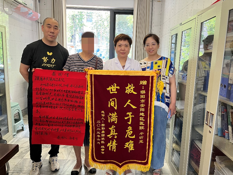 “我要把这面锦旗送给牛昕慧护士,如果没有她的路过救助,我爱人真的会有生命危险,真的是太感谢她了”。6月27日上午,患者家属和五环体育中心经理,带着锦旗和感谢信专程到我院行风办表示感谢!