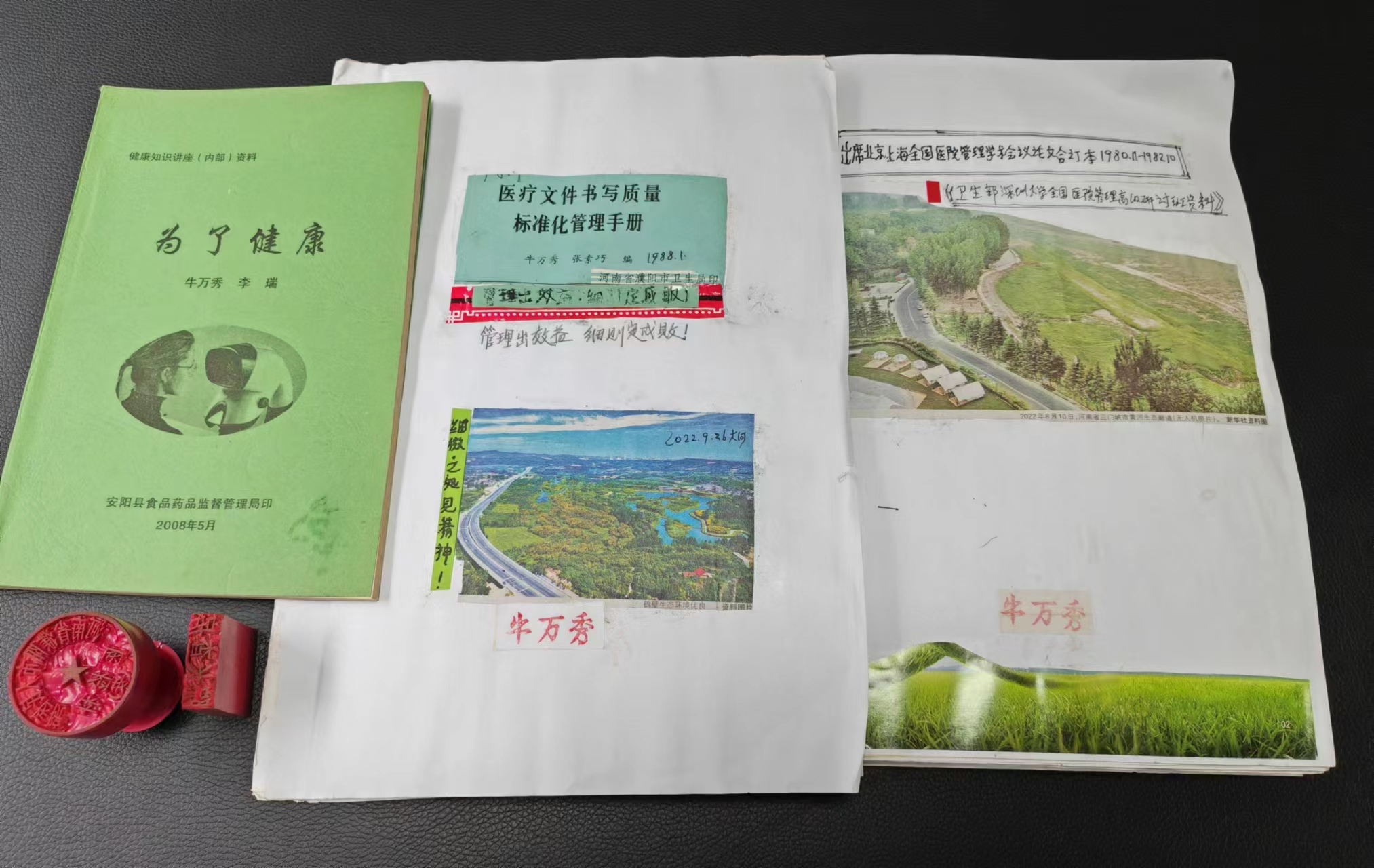 在老院长牛万秀家里,老院长把工作中手写的《医疗文件书写质量标准化管理手册》等珍贵资料交给院党委书记刘勇波,刘书记表示一定要组织专家好好研究,并保存在院史馆内。