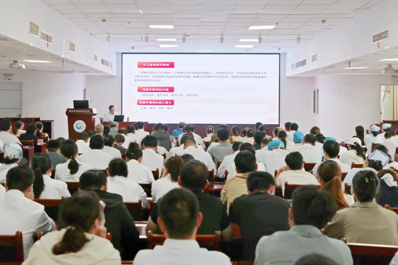 党课重点宣讲了地区医院的建院历程和梅庚年精神内涵。同时指出了医院当前面临的共性和个性问题,并分析总结了医院发展建设的三大优势:一是党的领导,二是梅庚年精神,三是群众信任。