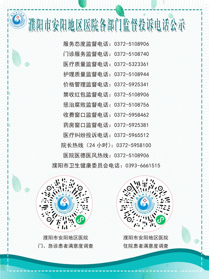 濮阳市安阳地区医院各部门监督投诉电话公示
