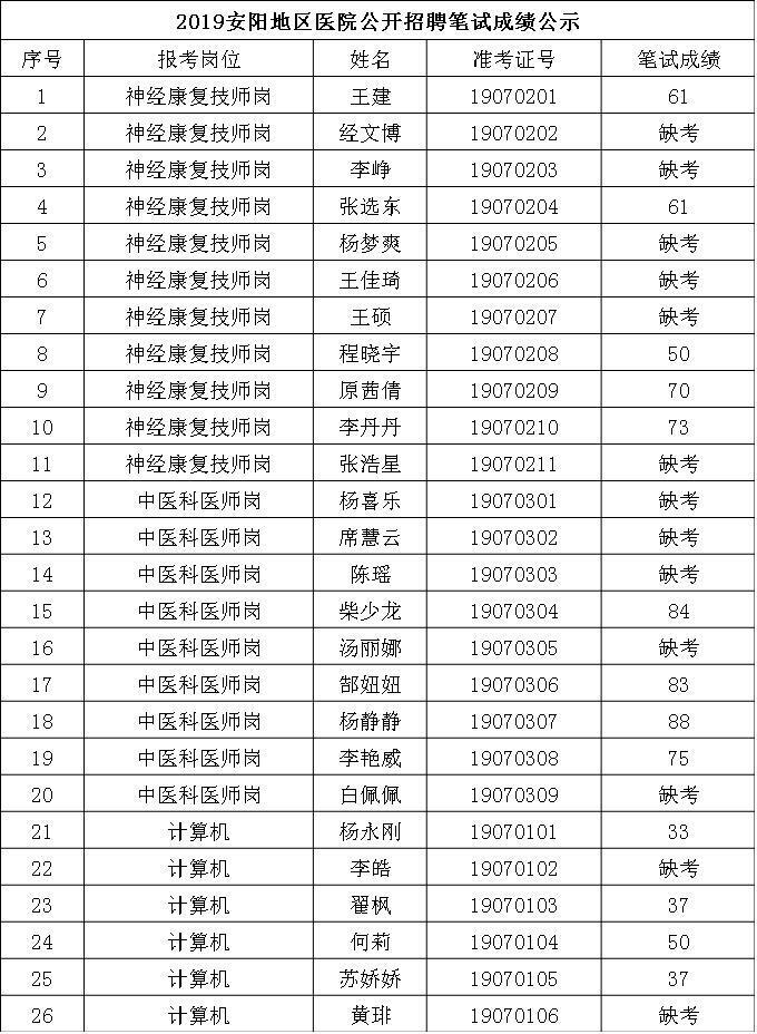 2019安阳地区医院公开招聘笔试成绩公示