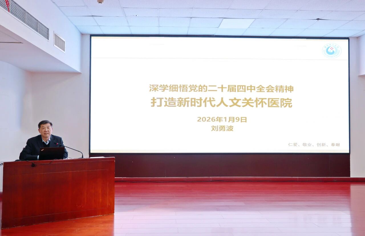 为深入学习贯彻党的二十届四中全会精神,推动全会精神在医院落地生根、见行见效,1月9日,院党委书记刘勇波以《深学细悟党的二十届四中全会精神 打造新时代人文关怀医院》为主题,为全院带来一堂深刻而生动的党课。会议由党委委员、副院长刘洁主持,院领导班子全体成员,各党总支书记、党支部书记,行政职能科室正、副主任,临床、医技科室主任或负责人,全体护士长等200余人参加学习。